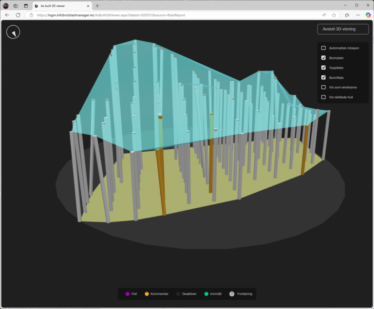 Med As-Built laster du ned dine borede hull direkte fra boreriggen til Blastmanager. Velg å se borehullene i roterende 3D-visning eller 2D-visning på kart. Du får enkel tilgang til all data, samt kommentarer på avvik.