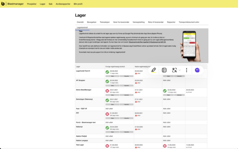 Utfør lagertransaksjoner og generer transportdokument mot dine sprengstofflagere i Blastmanager. Fra din mobiltelefon får du full oversikt over lagerbeholdning og med enkelthet kan du foreta uttak eller registrere produktforbruk på salva.