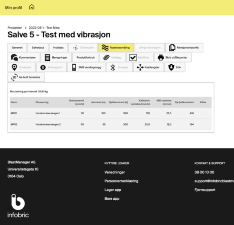 Her kan du koble til din maskinvare fra de fleste leverandører og motta automatisk overføring av data fra måleinstrumentene. Du får en automatisk vibrasjonsberegning før sprengning samt måling av faktisk vibrasjon etter sprengning.